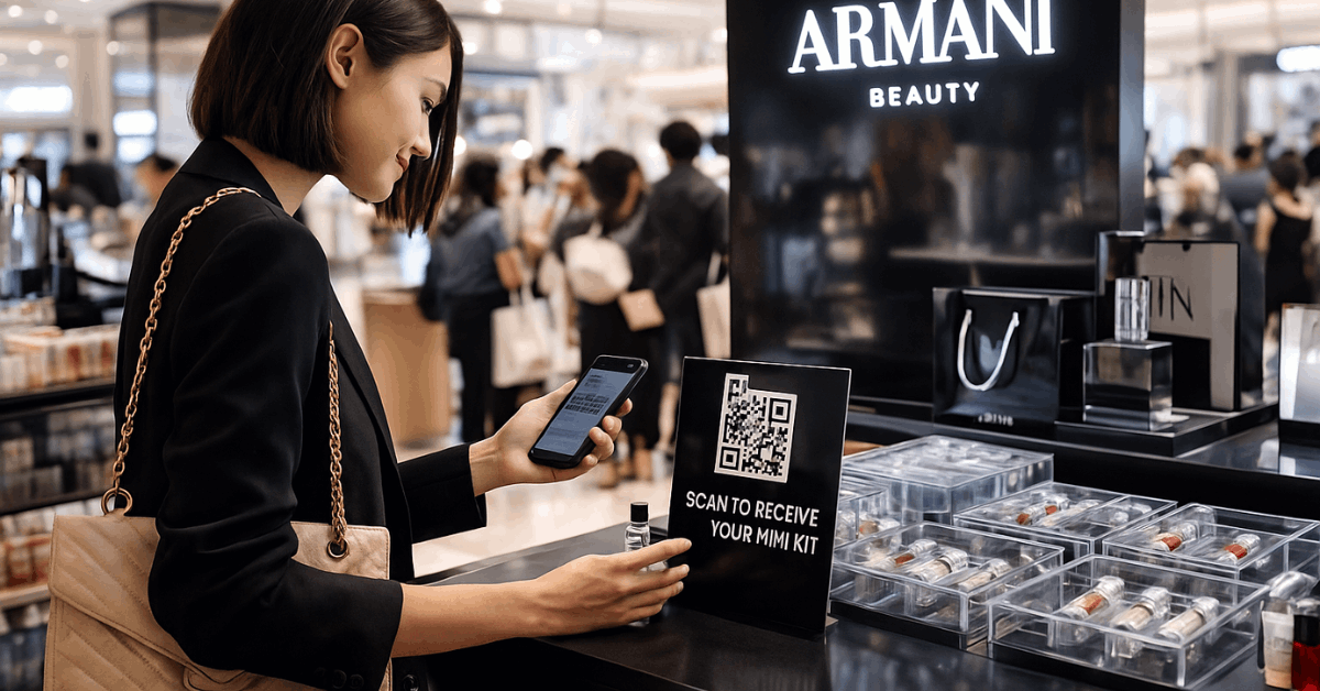 Recent Singapore examples spotlighted an Armani Make-up Lab at ION Orchard and other mall setups where attendees scanned a QR code, completed stations or a brief registration, and received a small kit that mixed foundation sachets and a fragrance vial.